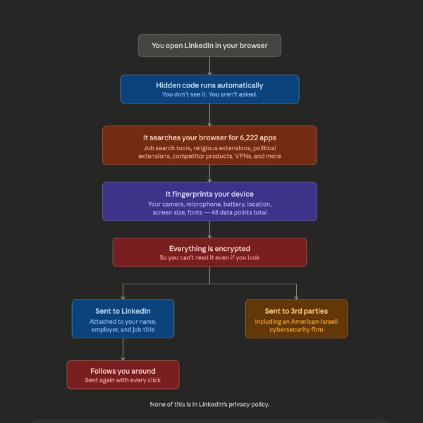Every time you visit LinkedIn on Chrome, Edge, Brave, or Arc, hidden code may be scanning your computer for installed software as well as sending the results back to LinkedIn’s servers. You did not consent to this, you did not receive a notification, nor was this mentioned in their privacy policy. If you’ve ever used a job search extension while quietly looking for a new role, LinkedIn may know and tie this data to your real name and your current employer. If you use a religious, political, or accessibility extension, LinkedIn may have that too. The scan covers 6,222 software products with a combined user base of 405 million people, and it’s growing by roughly 12 new extensions per day. LinkedIn is also feeding your data to third-party companies you’ve never heard of, including an American-Israeli cybersecurity firm, through invisible tracking elements hidden off-screen on the page. Moreover, they built this system during the exact period when European regulators ordered them to open up to competition. So, instead of complying, LinkedIn expanded surveillance of the very tools the law was designed to protect. Crazy!